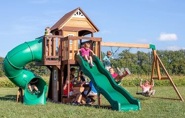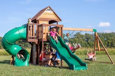 Backyard Discovery, Cedar Cove Wood Swing Set, Playground Fort, Chalkboard, Telescope, Dual Slide, Kitchenette, Wide Swing Lanes, 5ft Rock Wall, Step Ladder