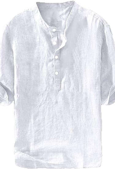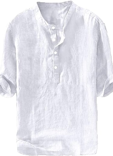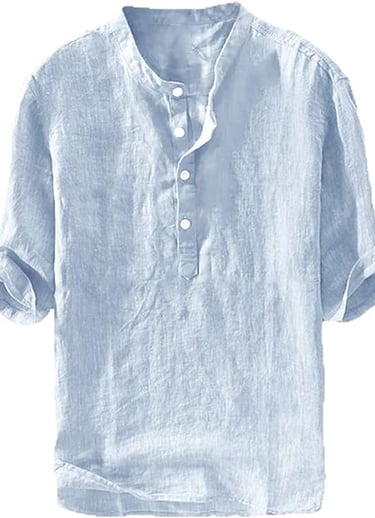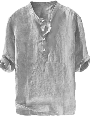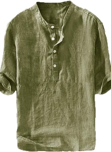 Mens soft, solid color, lightweight, v neck, 3/4 sleeve can be rolled-up, collarless, 1/4 placket stops at the top of the chest with buttons, plain, loose fit, high low hem.